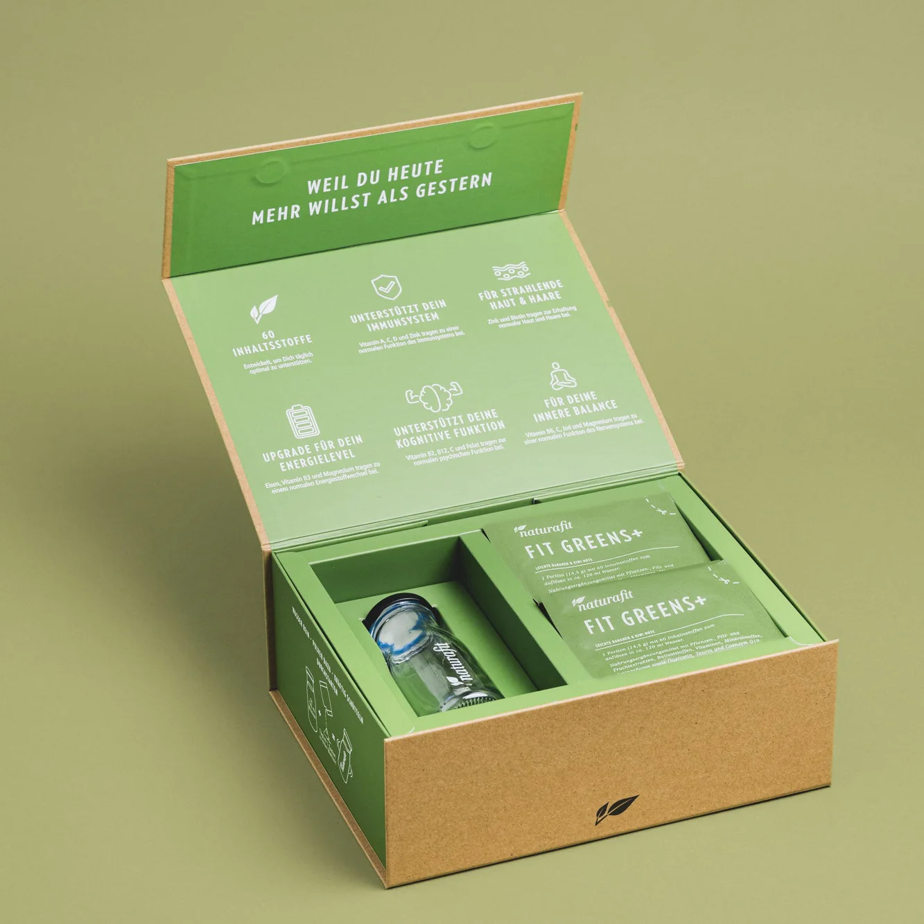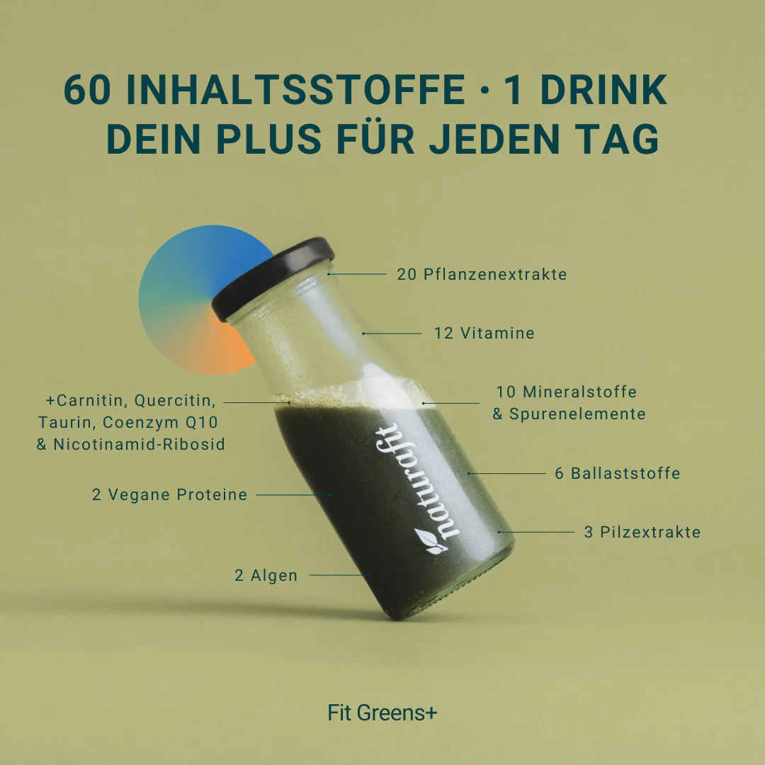 FIT GREENS+ ist ein Daily-Greens-Drink, der 60 sorgfältig ausgewählte Inhaltsstoffe vereint. Die Formel kombiniert Pflanzenextrakte, Vitalpilze, Algen, Vitamine, Mineralstoffe sowie funktionelle Spezialsubstanzen wie Q10, Taurin und Nikotinamid-Ribosid in einer hochwertigen Rezeptur.